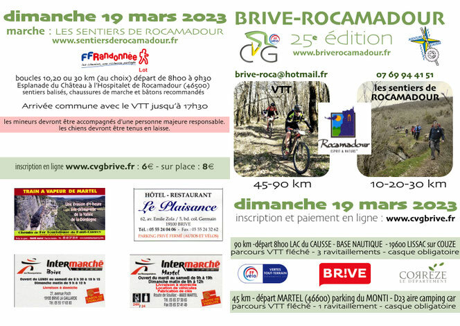 - VTT Brive Rocamadour 90 km (Départ à 8h) : retrait des dossiers le samedi 18 mars 2023, de 17h à 19h et le dimanche 19 mars 2023, à partir de 7h à la base nautique de Lissac-sur-Couze. Parcours fléché, ravitaillement au km 25, à Martel et au km 67,
